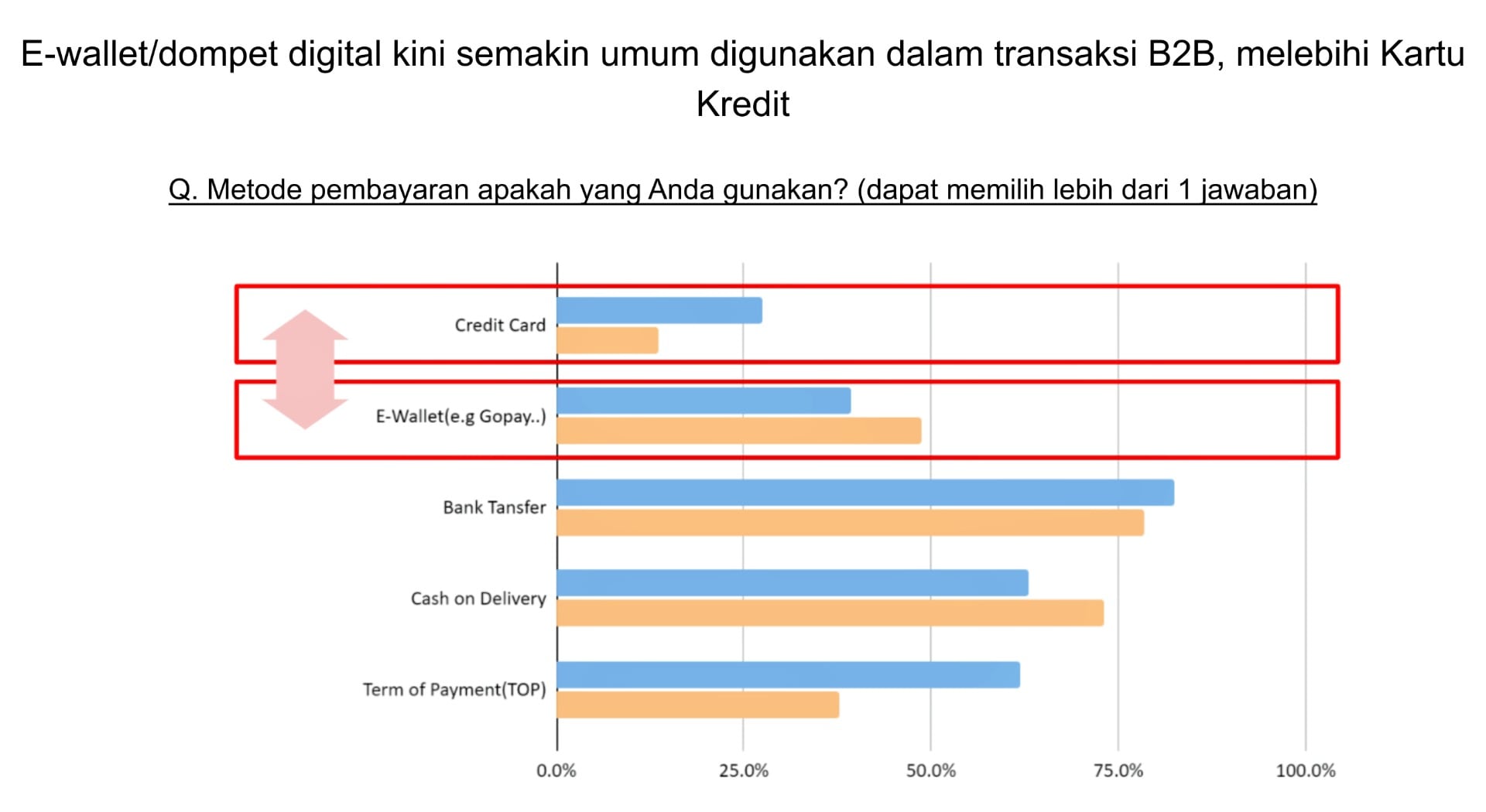 Hal yang cukup mengejutkan adalah setelah pandemi, metode pembayaran e-wallet pada transaksi B2B ternyata meningkat cukup signifikan, dimana sebelum pandemi e-wallet hampir bisa dikatakan bukan metode pembayaran yang ideal bagi perusahaan.