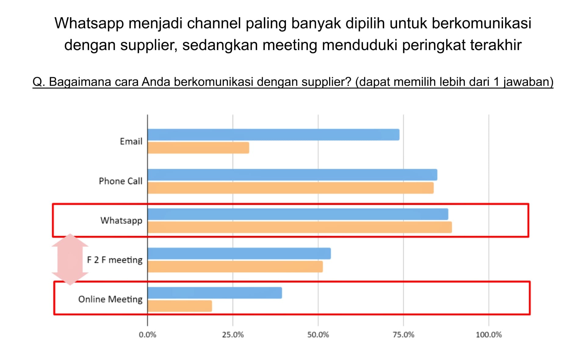 Cara berkomunikasi dengan supplier pun menjadi perhatian, dimana pelanggan lebih menyukai cara yang lebih praktis dan cepat seperti Whatsapp, telepon dan email dibandingkan dengan meeting, baik secara langsung maupun online.