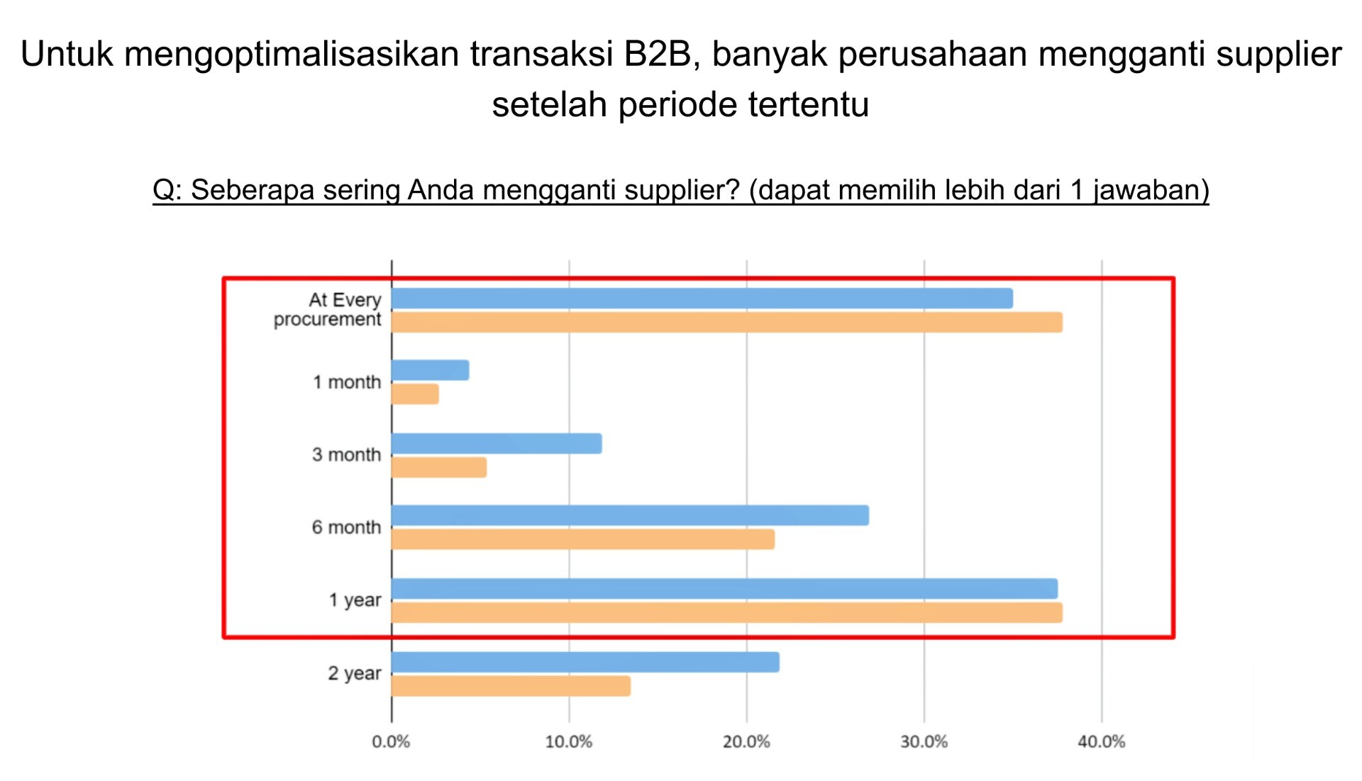 Jika berbicara tentang tingkat loyalitas pelanggan (bisnis, tidak termasuk individu) terhadap supplier/penyedia barang, dapat dilihat dari seberapa sering mereka mengganti/beralih ke supplier lain. Terlepas dari berbagai latar belakang seperti perubahan harga, ketersediaan barang, pergantian PIC (Person in Charge - seringkali terjadi pada B2B ), ternyata hasil survey kami menunjukkan :