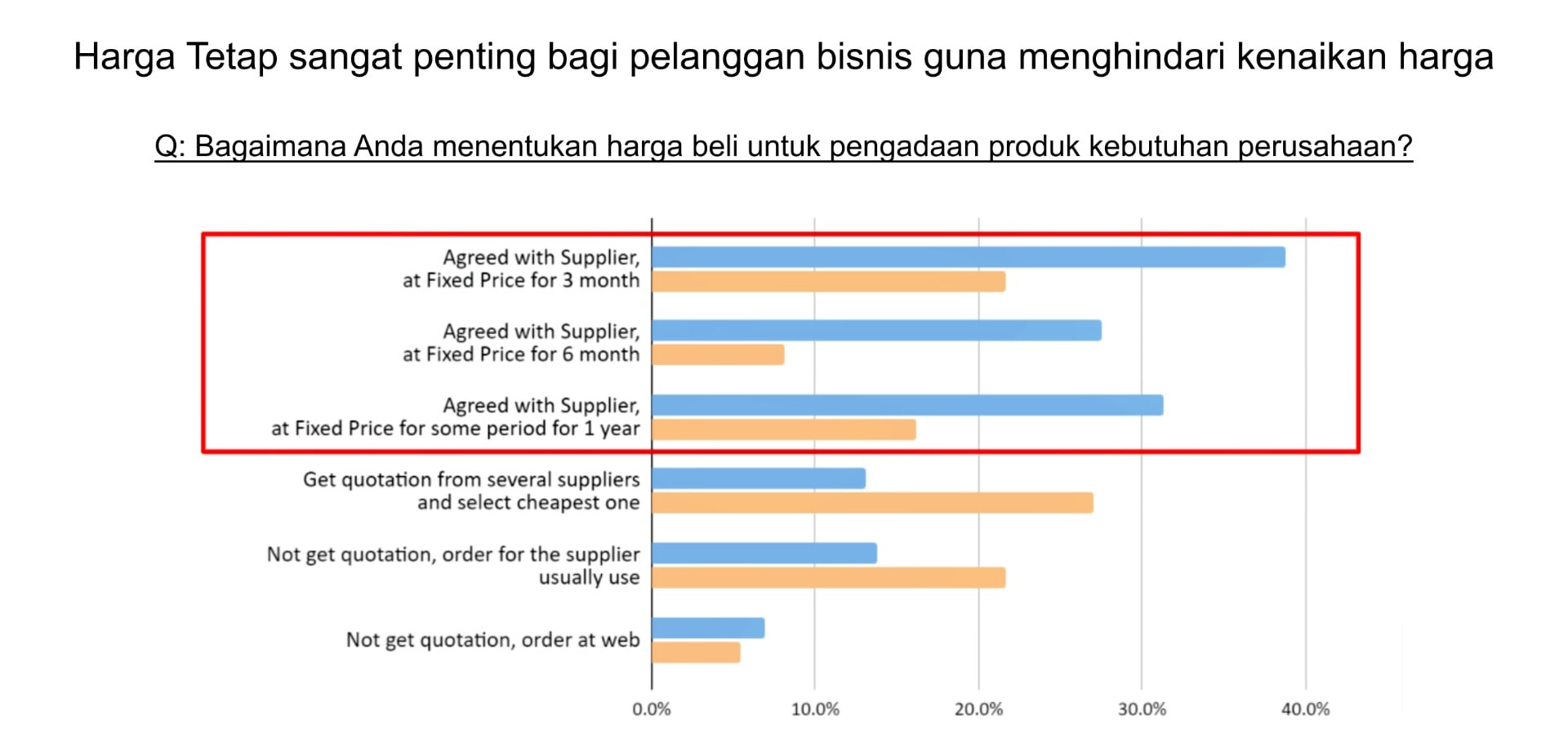 Walaupun tidak menjadi faktor utama, harga tentunya tetap menjadi salah satu hal terpenting dalam membuat keputusan pembelian dan pemilihan supplier. Dan bagi pelanggan B2B, jaminan atas harga yang tetap selama periode tertentu ternyata menjadi hal yang sangat penting. Terbukti bahwa berdasarkan data, hampir 40% dari pelanggan B2B memilih supplier yang dapat memberikan jaminan harga yang sama untuk setidaknya dalam kurun waktu 3 bulan ke depan.