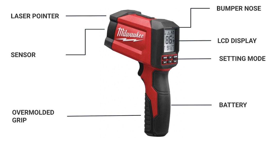 - Laser Pointer : Membantu membidik area yang ingin diukur oleh pengguna, lebih presisi sehingga hasil lebih akurat.