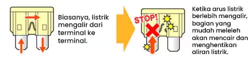 Struktur sekring terdiri dari dua terminal yang dihubungkan oleh kawat tipis yang mudah meleleh (fusible link). Saat terjadi lonjakan arus yang berlebihan akibat korsleting atau penyebab lainnya, kawat tersebut akan meleleh dan memutus aliran listrik, sehingga melindungi rangkaian dari kerusakan. melindungi rangkaian dari kerusakan. Oleh karena itu, jika Anda menambahkan komponen listrik ke mobil, pastikan untuk selalu memasang sekring di antara perangkat tersebut dan sumber daya positif (misalnya aki mobil).