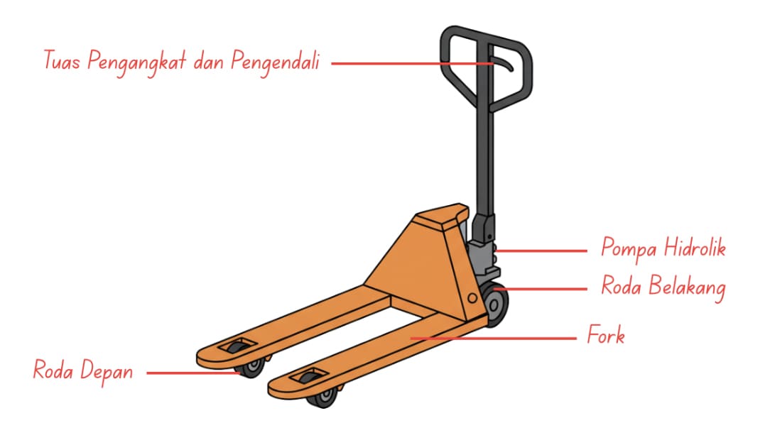 Sebelum memilih jenis hand pallet yang tepat, penting untuk memahami komponen utama dan fitur yang membentuk alat ini. Setiap bagian memiliki fungsi tersendiri yang saling mendukung agar hand pallet dapat bekerja dengan optimal dan aman.