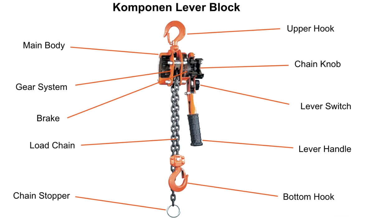 Lalu, apa itu Manual lever block? Pada dasarnya dua alat ini memiliki tujuan dan konsep yang sama, namun pada Manual lever block, alat ini menggunakan prinsip tuas untuk mengangkat beban. Terdiri dari frame, load chain, lever handle, load wheel, dan hook. Berbeda dengan chain block yang mengandalkan rantai dan putaran roda gigi, lever block dioperasikan dengan menarik tuas secara berulang. Manual Lever block memiliki ukuran yang lebih compact dan ringan, sehingga lebih mudah dibawa dan digunakan di area sempit, sulit dijangkau alat berat.