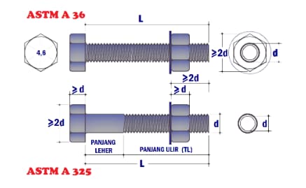 1. ASTM A325: Baut dengan jenis material ini memiliki grade tinggi dan sering disebut sebagai baut HTB (High Tension Bolt). Kekuatan tarik minimumnya sama dengan standar ISO kelas 8,8.