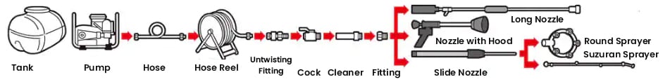 Saat menggunakan power sprayer, awali dengan memeriksa apakah power sprayer sudah tersambung dengan benar atau tidak. Urutan sambungannya adalah tangki, pompa, selang, gulungan selang, twist return bracket (braket putar), nozzle cock (pegangan keran), indikator pembersih, dan reducer (metal fitting yang menyambungkan metal fitting dengan diameter berbeda). Selanjutnya Anda perlu memasang nosel (seperti hooded pistol nozzle, slide nozzle, stick sprayer) pada reducer. Pada bagian ujung slide nozzle, Anda bisa menggunakan nosel yang berbentuk bulat atau nosel panjang dengan beberapa lubang.