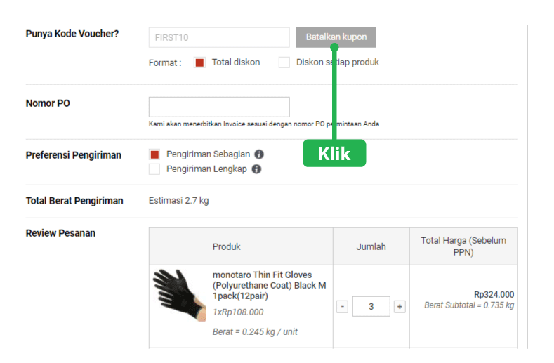 Jika Anda ingin membatalkan penggunaan kode voucher atau mengganti dengan kode lainnya, silahkan klik Batal