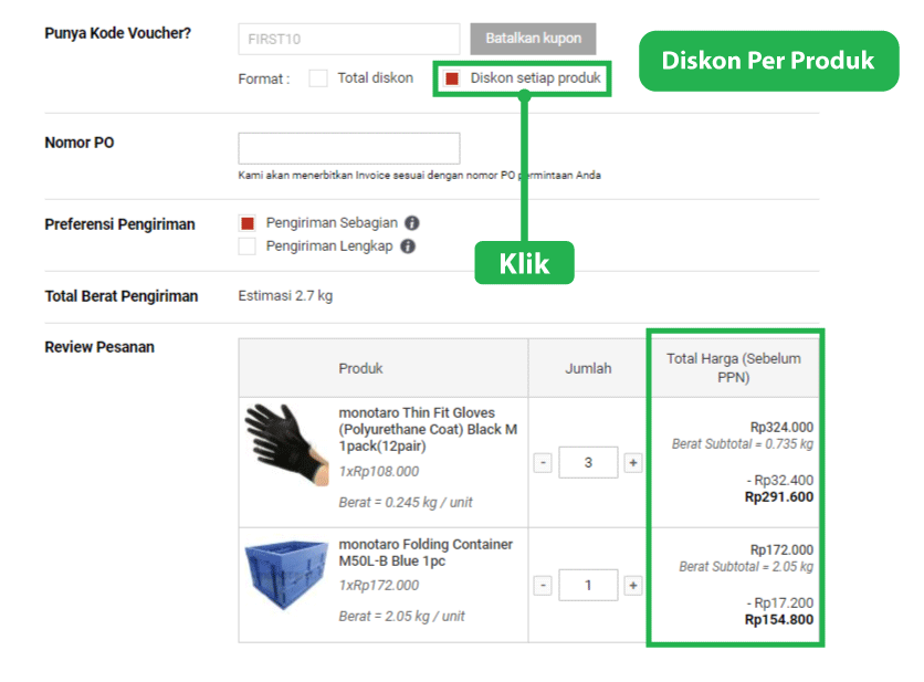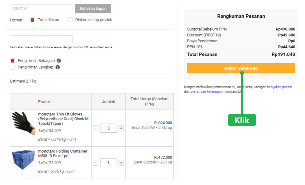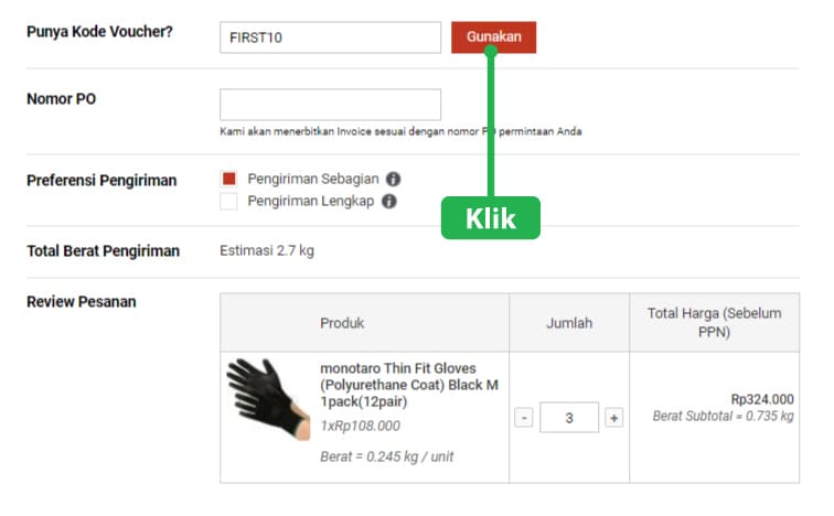 Pilih alamat pengiriman dengan lengkap lalu pilih metode pembayaran, lalu masukkan kode voucher diskon yang Anda miliki, lalu klik Gunakan