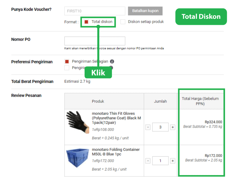 Potongan diskon akan secara otomatis memotong total harga barang belanjaan Anda. Anda dapat memilih tampilan diskon sesuai kebutuhan : Total Diskon (implementasi diskon pada Total Harga) atau Diskon Per Produk (implementasi diskon per produk).